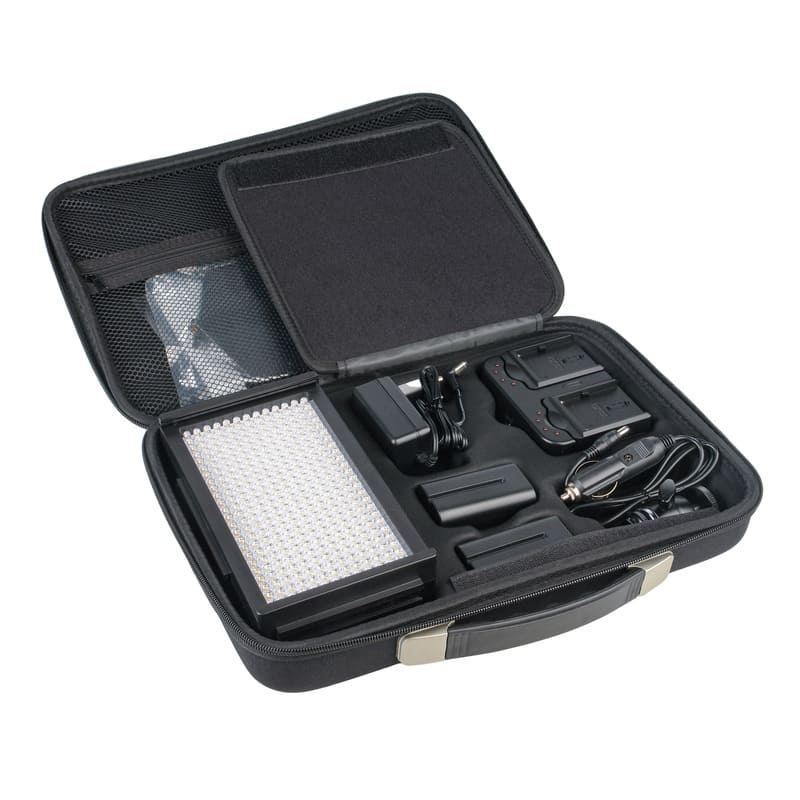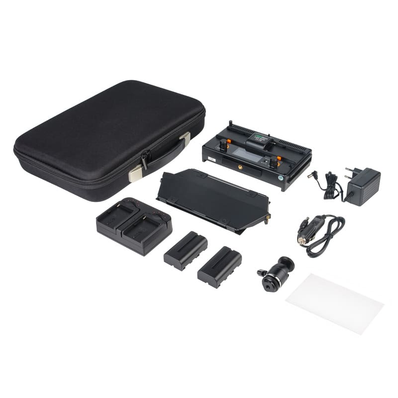 В комплект входят два литий-ионных аккумулятора типа NP-F, обеспечивающих около 100 минут работы прибора на полной яркости. На панели управления расположен ЖК дисплей, на котором отображаются все настройки. Прибор сохраняет стабильные параметры цветовой температуры и яркости даже при низком остатке заряда батареи.