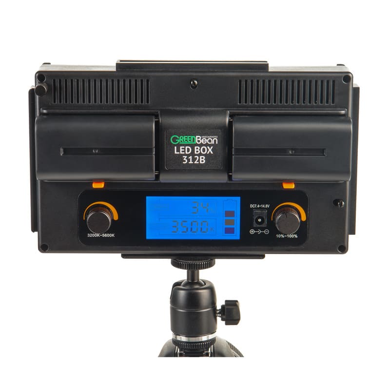 GreenBean LED BOX 312B — двухцветный накамерный светодиодный осветитель с регулируемой цветовой температурой 3200-5600 K и высоким индексом цветопередачи. Прибор, оснащенный 312 светодиодами, формирует мягкий равномерный световой поток без мерцания. Осветитель поставляется в полной комплектации: два аккумулятора NP-F, зарядное устройство, сетевой адаптер постоянного тока, автомобильное зарядное устройство, шторки, рассеиватель, шаровая головка с адаптером под холодный башмак и сумка для переноски.