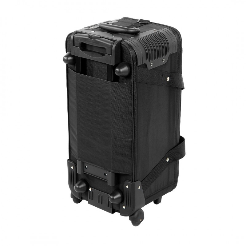 Удобство транспортировки обеспечено за счет двух ручек с фиксатором, съемного ремня на металлической фурнитуре, телескопической ручки и двух колесиков. Также верхний торец сумки оснащен металлической ручкой на пружине и по углам усилен пластиком.