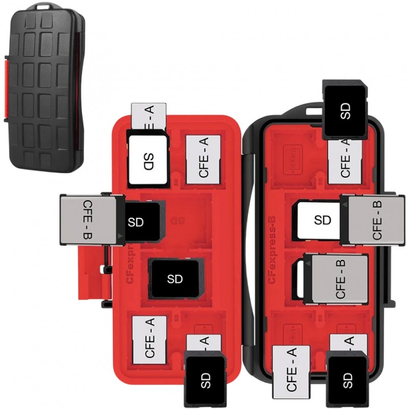 LensGo KH18C - кейс для карт памяти, созданный для профессиональных фотографов и видеографов, работающих с большим количеством носителей разных форматов. Его отличает специализированная организация внутреннего пространства на 24 слота, четко разделенных для карт (8 для CFexpress A, 4 для CFexpress B, 12 для SD) . Прочный корпус из ABS пластика с противоскользящей фактурой обеспечивает всестороннюю защиту от воды, пыли, песка и механических ударов, а система надежной фиксации с яркой красной защелкой гарантирует быстрое и безопасное открытие.