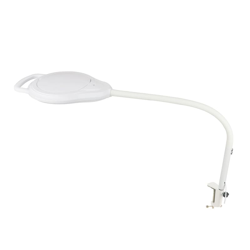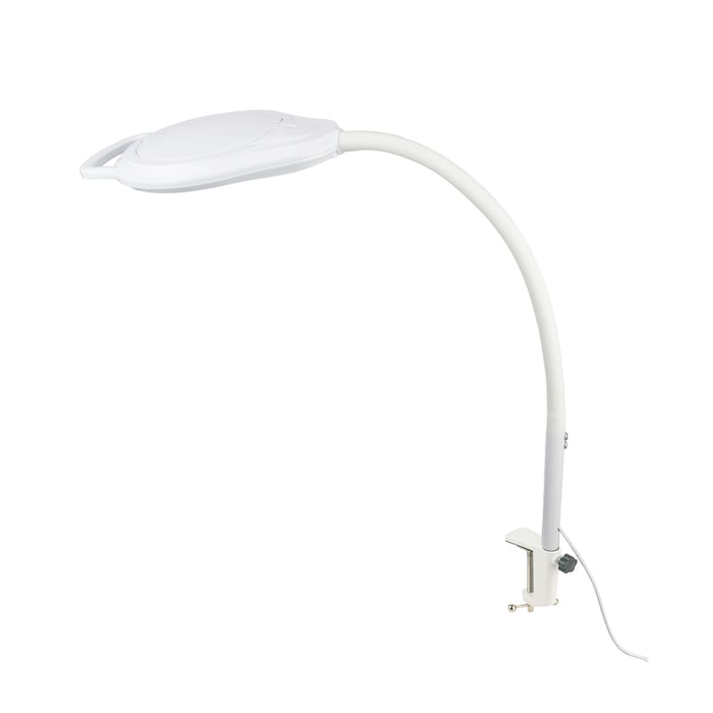 Лупа-лампа закреплена на гибком штативе, позволяющем располагать лупу на высоте 0 до 56 см над поверхностью стола. Штатив крепится с помощью металлической струбцины к плоским поверхностям – столам, верстакам, полкам толщиной до 5,5 см. Мягкие накладки струбцины защищают поверхность стола от царапин.