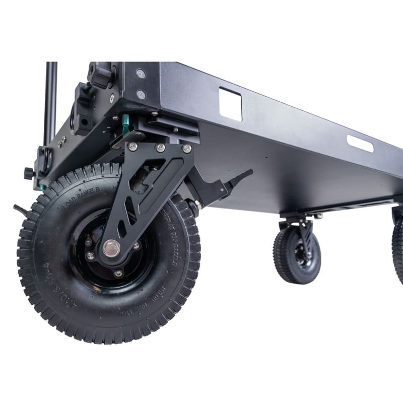 Колеса толщиной 75 мм произведены из сплавов магния и алюминия, оборудованы герметичными подшипниками и пневматическими шинами, устойчивыми к проколам и износу.