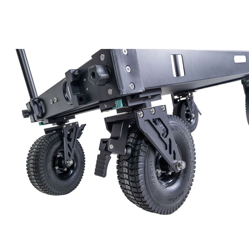 Операторская тележка оборудована четырьмя надувными колесами диаметром 260 мм, обеспечивающими плавный ход и отличное сцепление с любыми поверхностями. Два колеса имеют поворотный механизм и встроенный ножной тормоз, что позволяет уверенно маневрировать и фиксировать тележку в нужном месте. Быстросъемное крепление колес ускоряет сборку и разборку конструкции.
