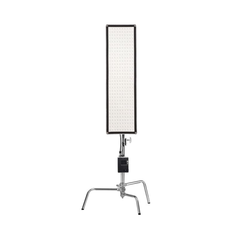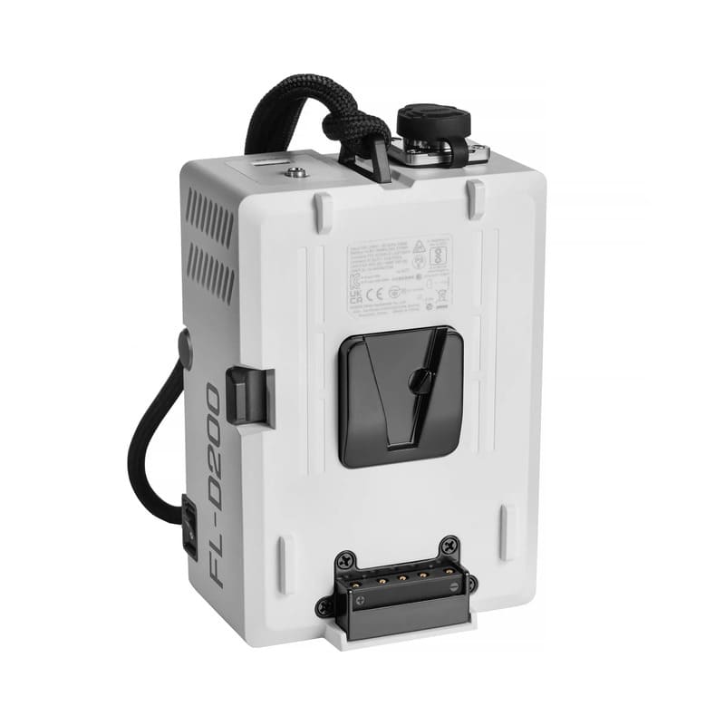 Осветитель питается от сети или от аккумулятора V-mount, позволяющего прибору работать автономно и сохранять непрерывность рабочего процесса. Площадка для установки аккумулятора, как и разъем для подключения кабеля, распложена на блоке управления панелью.