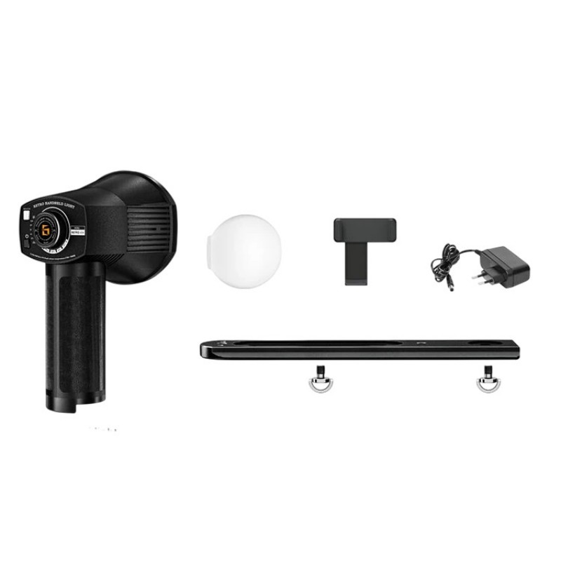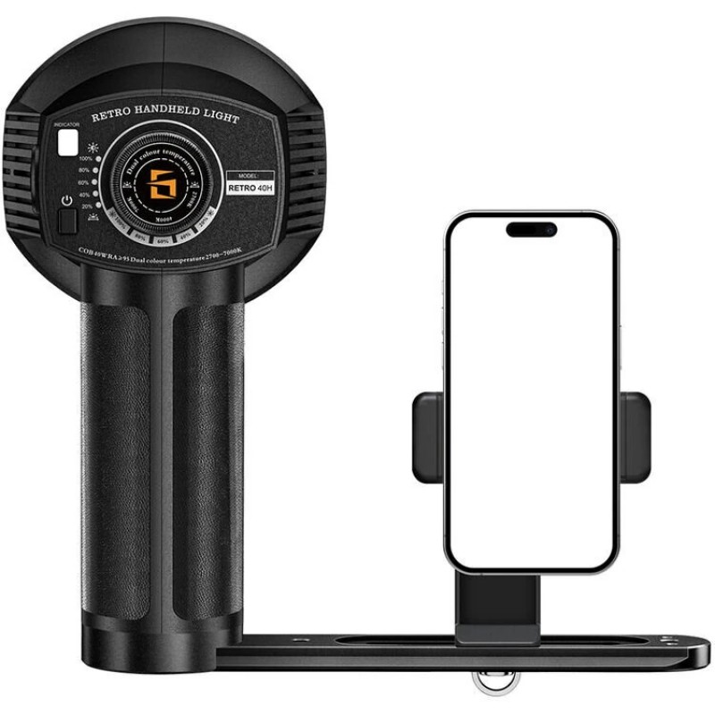 LensGo 40H представляет собой портативный 6-цветный моноблок с ретро дизайном и текстурой под кожу. Его главное отличие это универсальность использования как с камерами, так и со смартфонами, благодаря комплектной скобе для крепления на фотоаппарат и держателю для телефона. Устройство создано для ведения видеоблогов, создания контента и портретной съемки, предлагая профессиональное качество света в компактном корпусе.