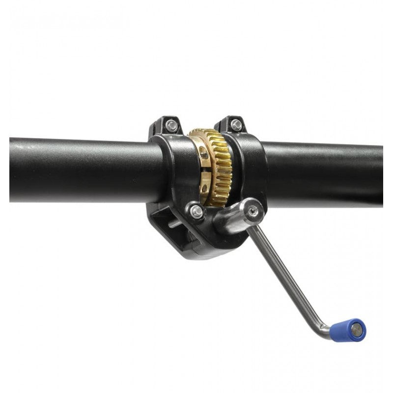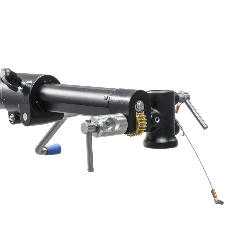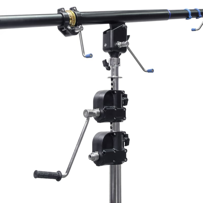 Двухсекционная перекладина-журавль обеспечивает установку, подъем и управление положением установленного осветителя с помощью редукторных коленчатых рукояток, которые позволяют плавно поворачивать, наклонять и вращать закрепленный на журавле осветительный прибор. Механизм телескопического выдвижения секций перекладины служит для точного позиционирования оборудования в сложных съемочных условиях.