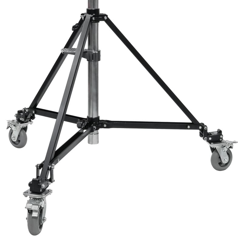 Свободное перемещение стойки в студии возможно благодаря колесам диаметром 150 мм. Каждое колесо имеет тормоз для блокировки движения и вращения. Резиновые протекторы колес гасят вибрации и шум, вызванные перемещением стойки по поверхности.