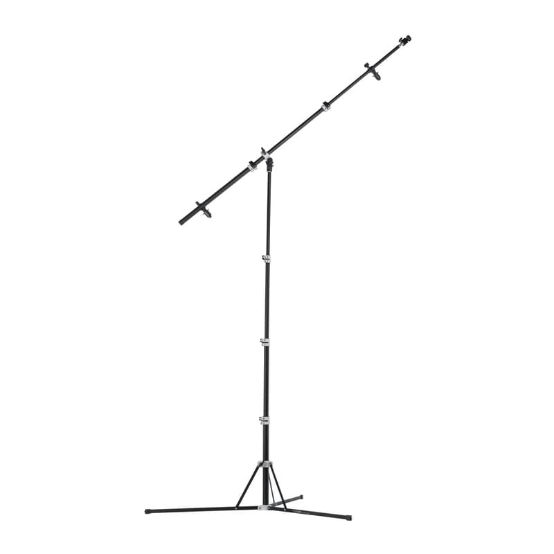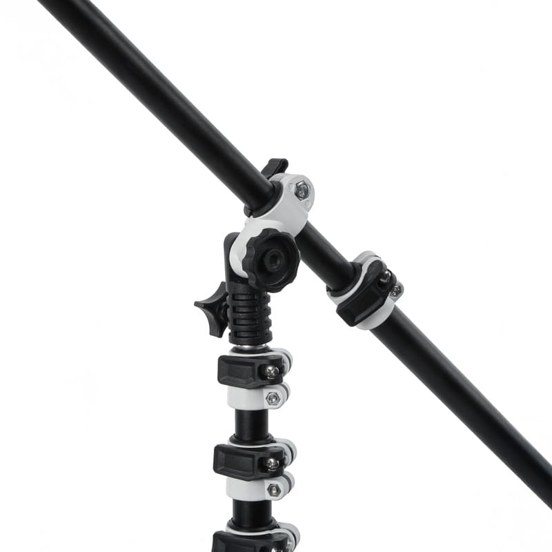 Телескопическая съемная перекладина, состоящая из трех секций, регулируется по длине от 500 до 1300 мм. На стойку штанга устанавливается с помощью поворотной втулки с гнездом 5/8", которая фиксируется винтовым зажимом. Механизм кронштейна с храповиком позволяет точно настроить угол наклона стрелы и предотвратить ее случайное смещение во время съемки.