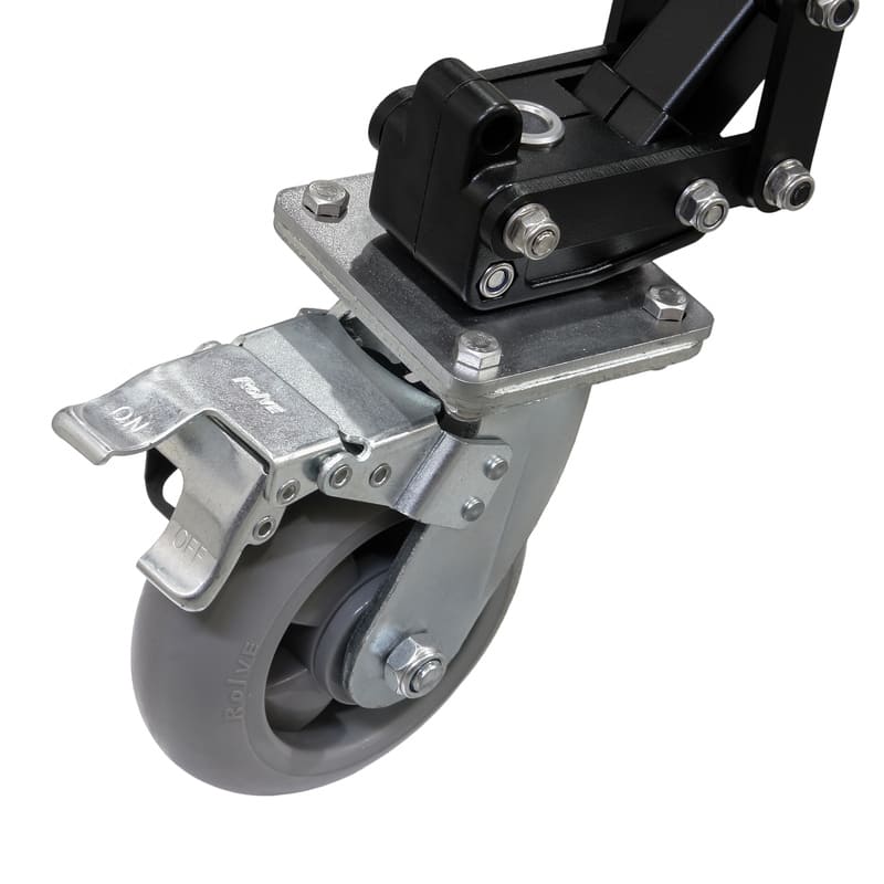 Свободное перемещение стойки в студии возможно благодаря колесам диаметром 150 мм. Каждое колесо имеет тормоз для блокировки движения и вращения. Резиновые протекторы колес гасят вибрации и шум, вызванные перемещением стойки по поверхности.