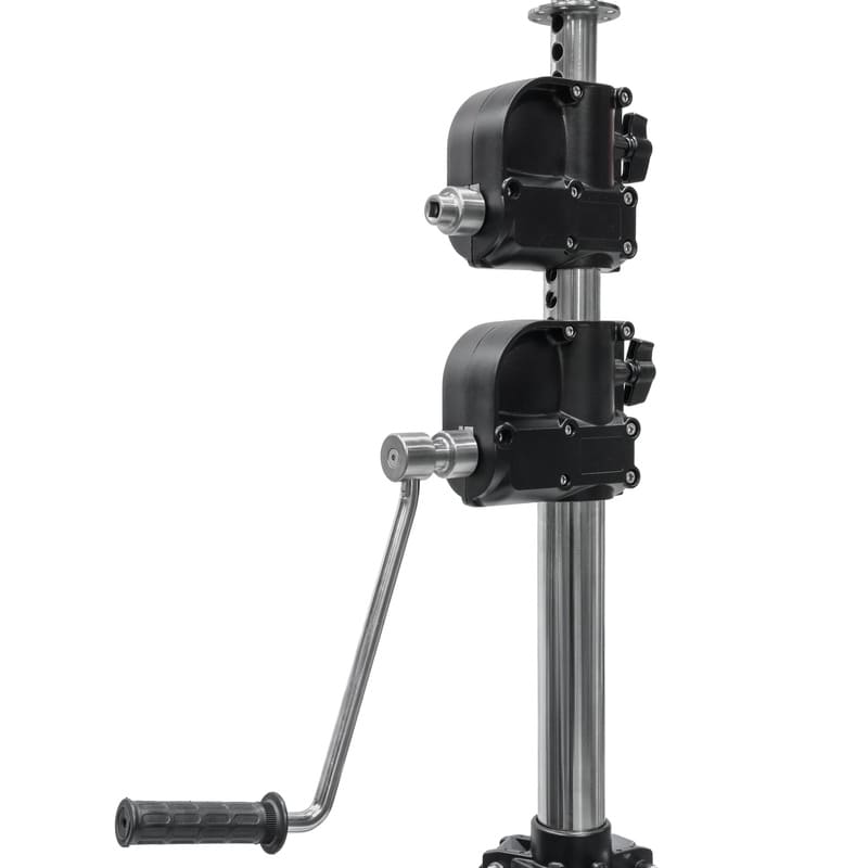 Трехсекционная центральная колонна стойки из нержавеющей стали выдвигается с помощью двух редукторов с корпусами из литого алюминиевого сплава, с ручным приводом с большой съемной рукояткой.