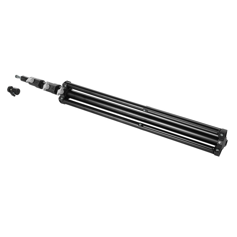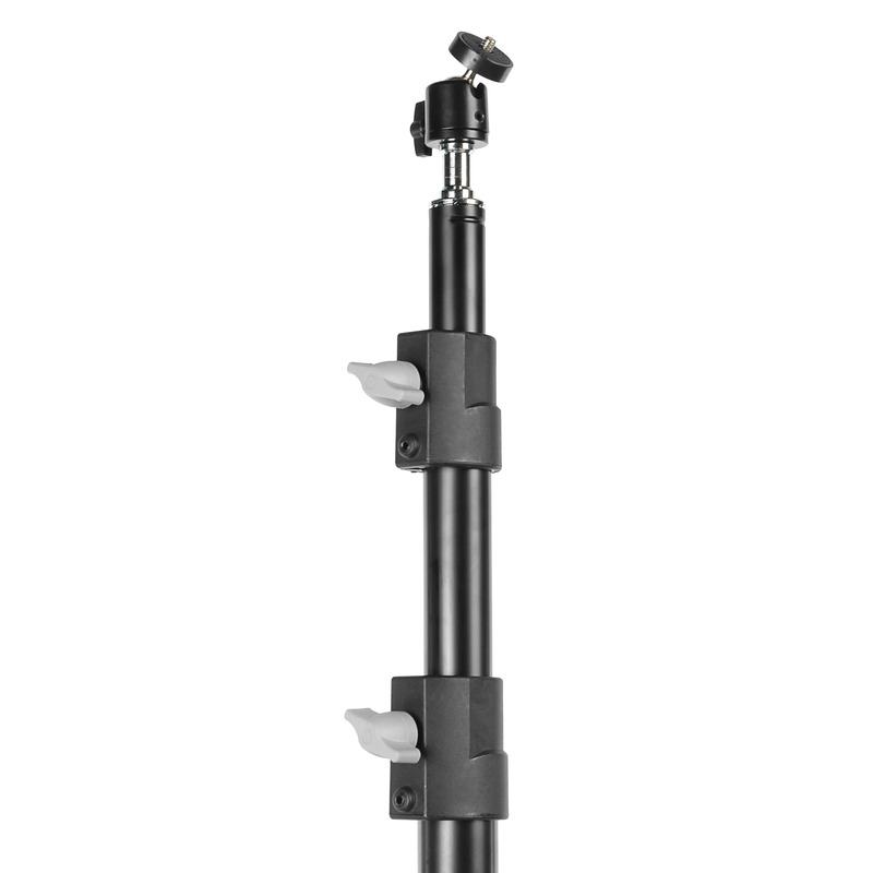 Телескопическая колонна стойки разделена на три секции большого диаметра, что позволяет значительно увеличить общую высоту без потери стабильности и жесткости конструкции. Прочные полимерные зажимы надежно фиксируют каждый сегмент, защищая механизмы от износа и обеспечивая плавное движение секций.