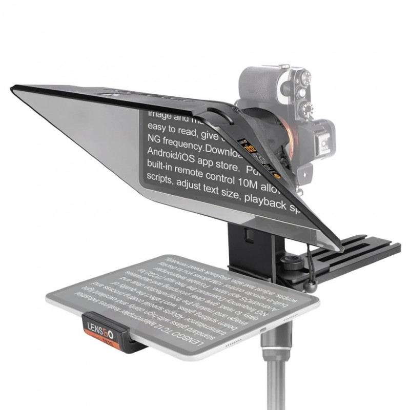 Телесуфлер с регулируемой конструкцией, позволяющей использовать для чтения планшет до 12.9". Это обеспечивает удобство работы и профессиональное качество съемки, а благодаря резьбе 1/4" модель легко устанавливается на штатив или стойку, обеспечивая удобное положение для съемки. Разработан для работы с камерой, которую можно отрегулировать по высоте, а муфта предотвратит просачивание света на экран.