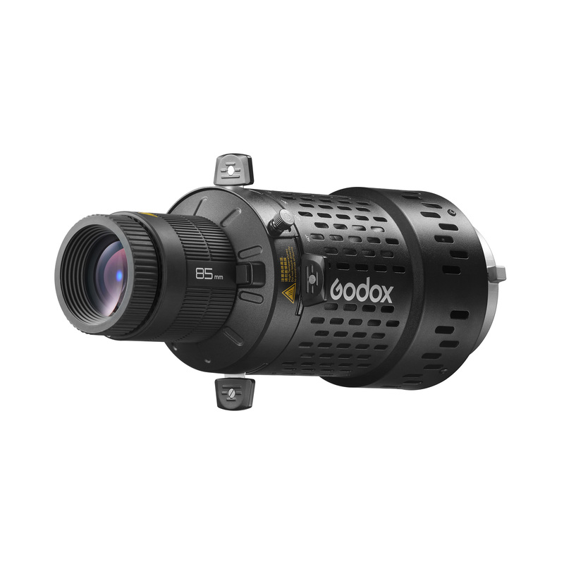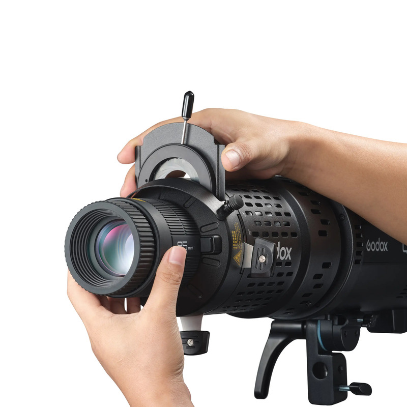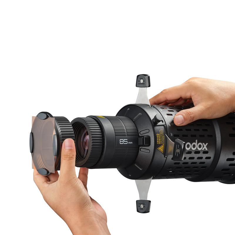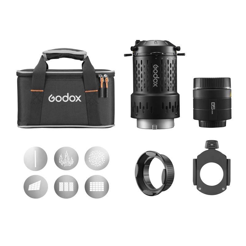 В комплект входит линза 85 мм. В ассортименте доступны линзы 48 мм, 65 мм и 150 мм, которые позволят адаптировать насадку под различные условия съемки. Линза 48 мм подходит для небольших пространств, а линза 150 мм обеспечивает высокую резкость. Эти линзы также совместимы с проекционной насадкой для вспышек Godox BLP.